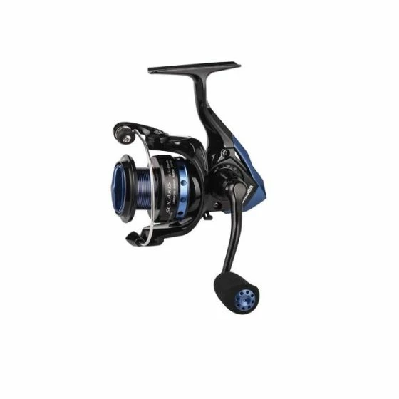 Okuma Solaris Spinning Reel equips with corrosion-resistant graphite body and metal handle, featuring 5 ball bearing + 1 roller bearing, aluminum black spool with blue anodizing, and quick set infinite anti-reverse system.