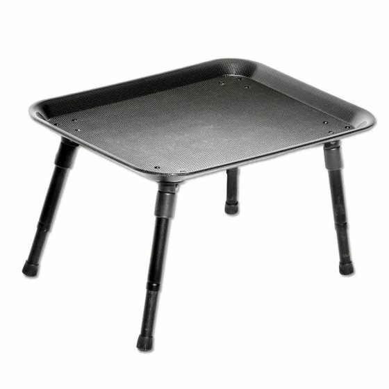 - The folding legs make this table a neat and compact accompaniment to your tackle. The legs are also adjustable for levelling and different height requirements. Finished in a black carbon effect.